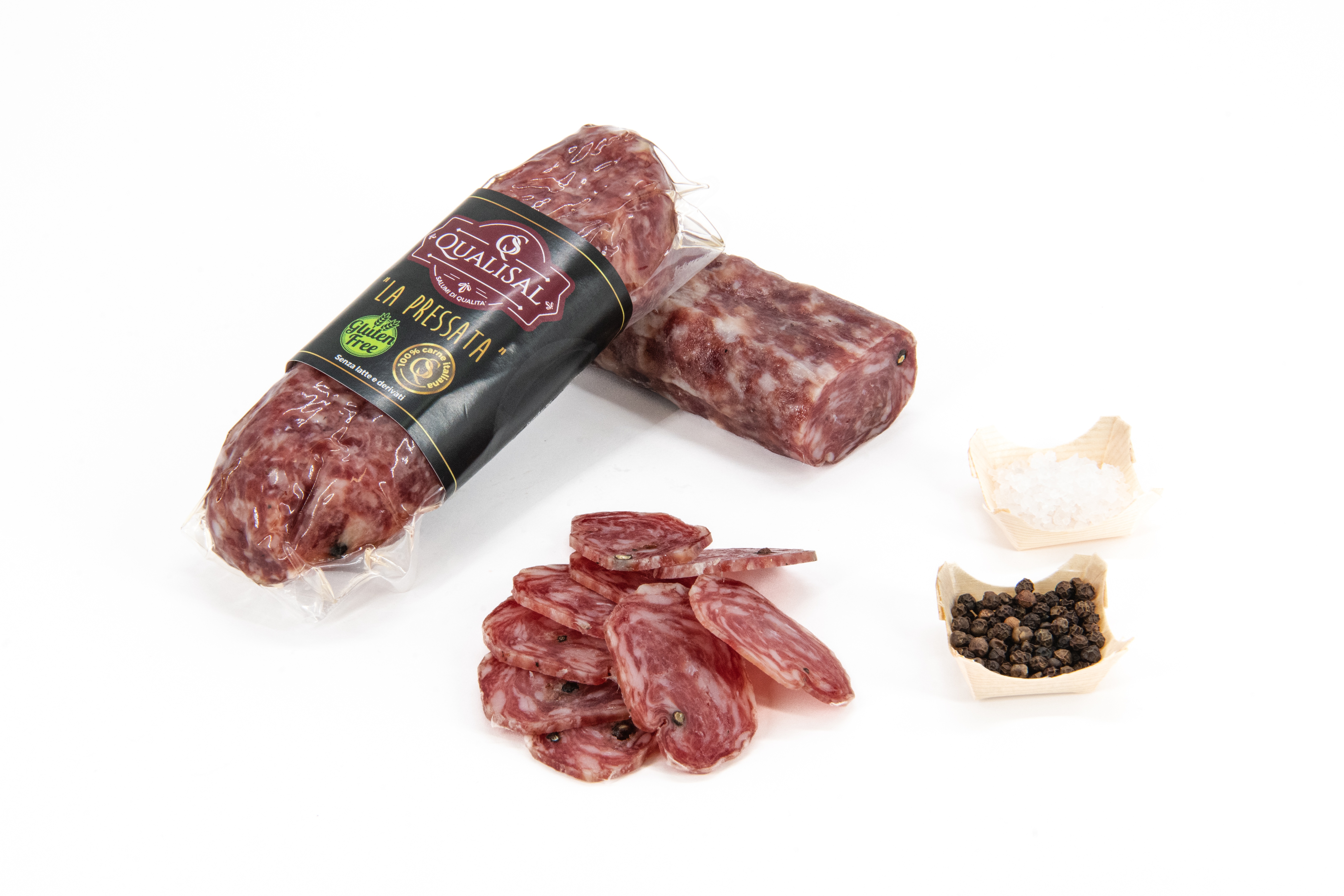 La Soppressata "La Pressata" è un insaccato di forma cilindrica, leggermente schiacciata. Ottenuto da carni selezionate della coscia e della lonza, successivamente tritate con una grana media, amalgamento con l'aggiunta di sale, aromi naturali, vino e pepe in grani.